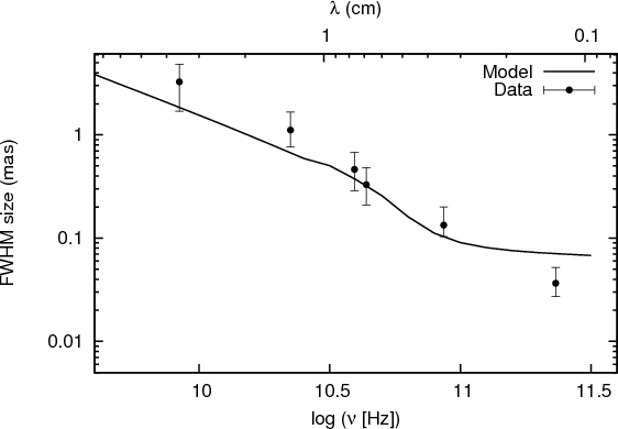 Figure 3: Comparison of model-predicted frequency-size relationship (solid line) with observations. The data are from Bower et al. (2004), Shen et al. (2005), and Doeleman et al. (2008), which were compiled and corrected for scattering by Falcke et al. (2009). |