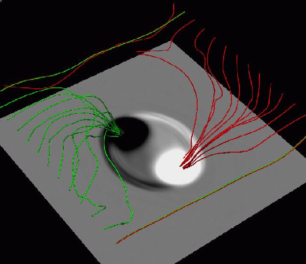 Figure 2: The field line structure of the corona after external reconnection. Red and green coronal lines are traced from opposite sides of the box, x=-50 and x=50, respectively, at z=22 and t=70. A magnetogram shows Bz at z=0. |