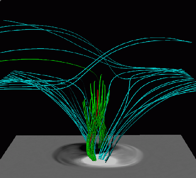 Figure 1: As the arcade of the emerging tube expands into the magnetized corona, the continued weakening of the overlying restraining field results in faster reconnection. |