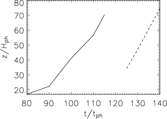 Figure 4: The height-time profiles for the two eruptions of the simulation. The curve for the first eruption is solid and the second is dashed. |