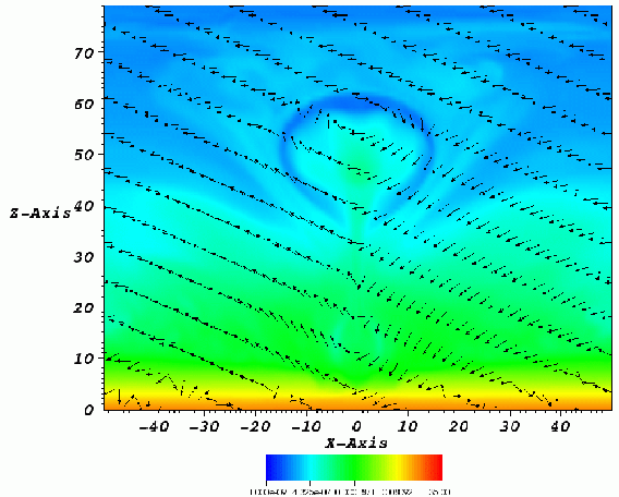 at t=132 by displaying the plasma density in the y=0 plane. Field line arrows are also shown to indicate the direction of the magnetic field in that plane.