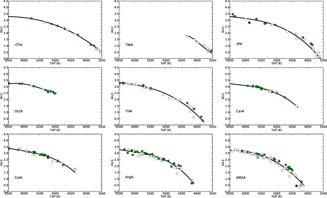 In Table 1, we present some properties of the young associations studied in this paper derived in TQMS08. The number of members (N), the number of Li eliminated stars (``intruders'', n), the average distance (in parsecs), and the age (in Myr) taken from TQMS08 are given in Table 1. Li abundances were measured for 376 stars. Although the data are mainly from Paper I, a few additional data obtained since then are included and will be published in forthcoming papers.