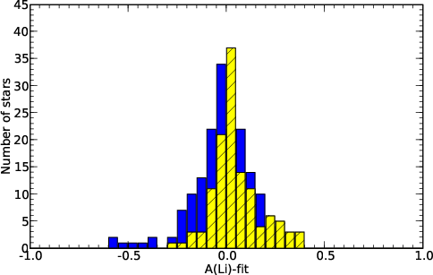 Figure 7: Histogram of the differences between the derived abundances and the polynomial fit to the observed LDP. Dark gray and hatched light gray bins represent stars rotating slower and faster than 20 km s-1, respectively. |