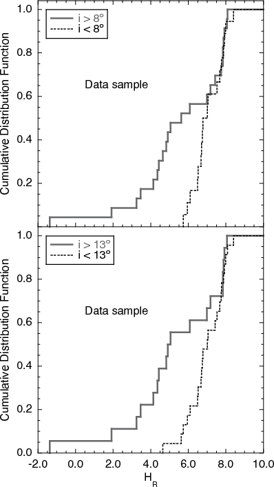 - there is an apparent concentration of small Plutinos with small inclination values and a concentration of large Plutinos at high inclinations;