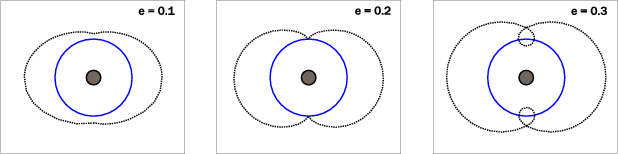 Figure 4: Typical path of a Plutino (dotted line) in the rotating frame of Neptune (full line) for different eccentricity values (e = 0.1, 0.2 and 0.3). Only high eccentricity values (e > 0.2) allow the Plutino to cross the orbit of Neptune. Due to the 3:2 mean motion resonance the trajectories are repeated every two orbits of the TNO around the Sun. |