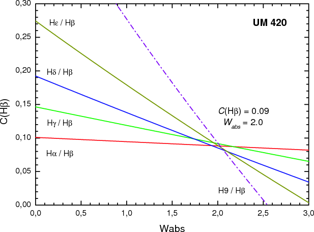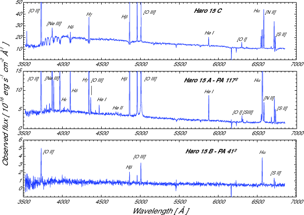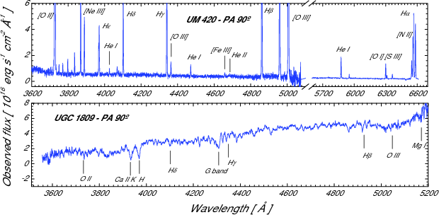 Figure 13: ISIS 4.2 m WHT spectrum for the center of UM 420 (top) and the galaxy UGC 1809 (bottom). Fluxes are not corrected for reddening. The most important emission lines have been labeled. |