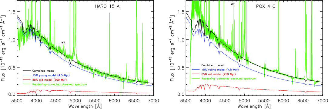 The broad emission features that characterize the spectra of WR stars are often observed in extragalactic H II regions. The so-called Wolf-Rayet galaxies constitute a very inhomogeneous class of star-forming objects: giant H II regions in spiral arms, irregular galaxies, blue compact dwarf galaxies (BCDGs), luminous merging IRAS galaxies, active galactic nuclei (AGNs), Seyfert 2, and low-ionization nuclear emission-line regions (LINERs). All objects have in common ongoing or recent star formation that has produced stars massive enough to evolve onto the WR stage (Shaerer et al. 1999). There are two important broad features that are indicative of WR stars in the integrated spectra of an extragalactic H II region: