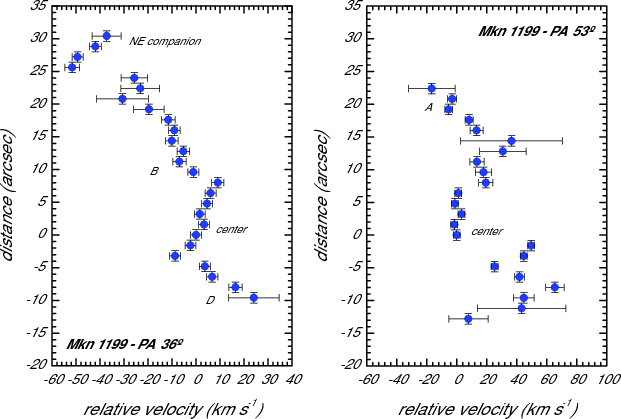 Figure 4: IDS INT spectra for the center of Mkn 1199 and the dwarf companion galaxy at its NE. Fluxes are not corrected for reddening. The most important emission lines have been labeled. See Fig. 5 in Paper I for the identification of the regions. |