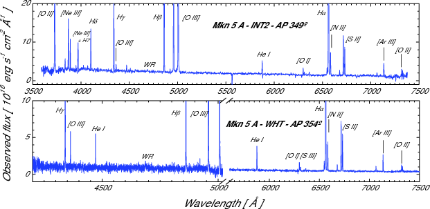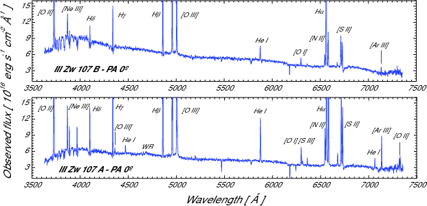 Figure 28: IDS INT spectra for the regions A (bottom) and B (top) of IRAS III Zw 107. Fluxes are not corrected for reddening. The most important emission lines have been labeled. See Fig. 27 in Paper I for identification of the regions. |
