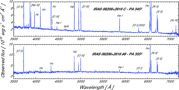 Figure 9: IDS INT spectra for the center of IRAS 0828+2816 and knot #8. Fluxes are not corrected for reddening. The most important emission lines have been labeled. See Fig. 9 in Paper I for the identification of the regions. |