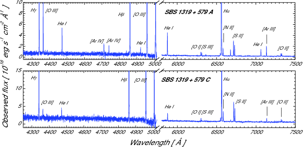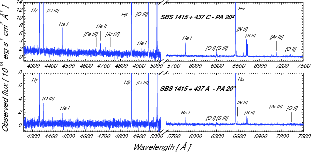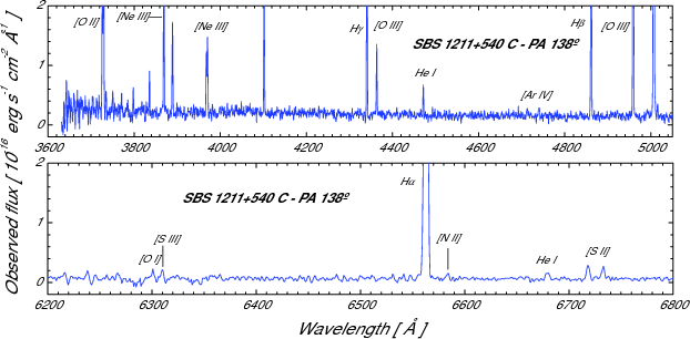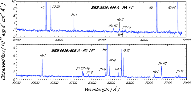 Figure 16: ISIS 4.2 m WHT spectrum for SBS 0926+606 A. Fluxes are not corrected for reddening. The most important emission lines have been labeled. See Fig. 15 in Paper I for the identification of this region. |