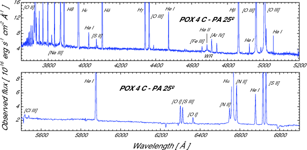 Figure 11: ISIS 4.2 m WHT spectrum for the center of POX 4. Fluxes are not corrected for reddening. The most important emission lines have been labeled. See Fig. 11 in Paper I for the identification of the regions. |