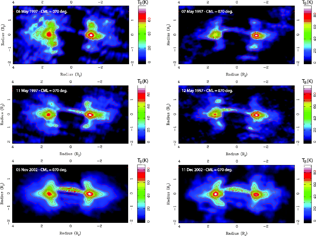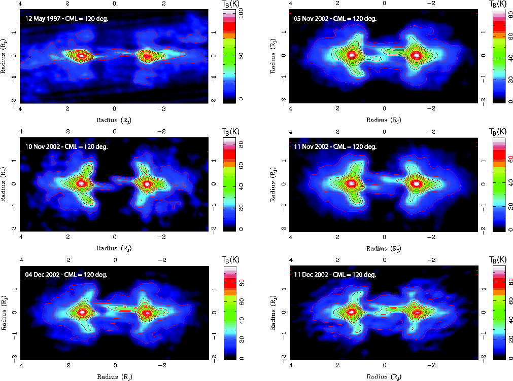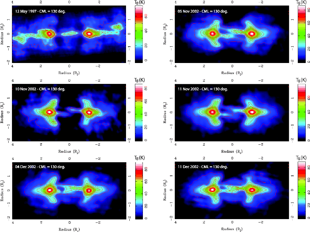 The first two-dimensional brightness distribution maps of the synchrotron-emitting region were provided by Berge (1966) and Branson (1968) and pointed out the presence of a confined electron population at the equator close to Jupiter. Later, higher resolution interferometric maps displayed the regions of intense emission along the equator and at higher latitudes (de Pater et al. 1982; de Pater & Dickel 1986; Leblanc et al. 1997; Santos-Costa 2001; de Pater & Dunn 2003). The features of such a brightness distribution have been recently interpreted by Santos-Costa & Bolton (2008).