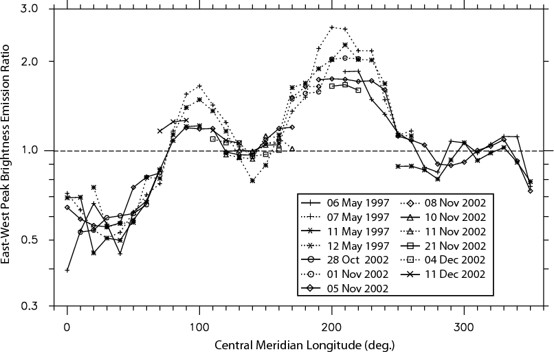 period, a full planet rotation could only be observed during the day of 5 November 2002. Figure 1 shows the central meridian longitudes (CMLs) monitored during the different observational days. Longitudes in the [
