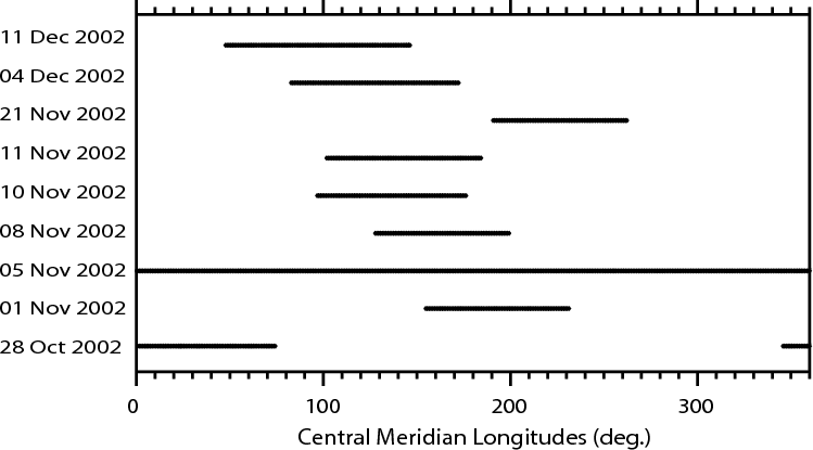 Figure 1: Central meridian longitudes coverage for each observation day of the VLA 2002 campaign (Sect. 2). |