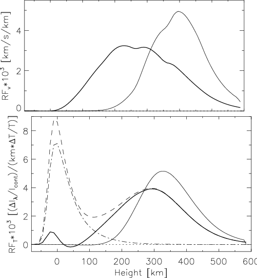 For a precise measurement of the Doppler shifts we reduced the noise and the fluctuations of spectrometer transmission on short wavelength scales (cf. Bello González & Kneer 2008, Sect. 2.1). For this we applied a filter whose Fourier transform is shown as the line spread function (LSP) by the dotted line in Fig. A.2. The LSP has an FWHM of 49 mÅ. It preserves well the general shape of the line profile. Thus, the finally measured line intensities, indicated by the asterisks in Fig. A.2 do almost not differ from the original (though convolved with the FPI transmission) profiles. But the filter mixes intensities from the line wings to the line centre and vice versa. The result is a lowering of the formation height of the velocity fluctuations and a broadening (in height) of the velocity response function.