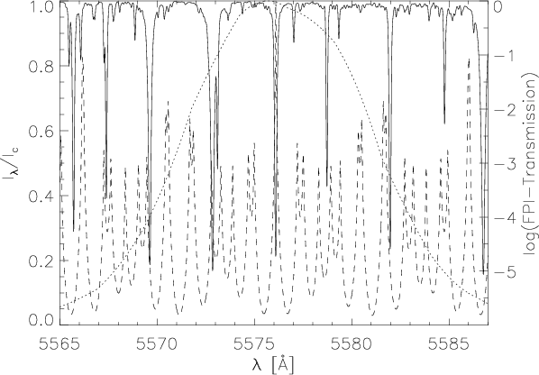 The influence of the broad pre-filter on the profile of Fe I 5576 Å is shown in Fig. A.2. There, the dashed profile is from the FTS atlas and the solid profile the FTS profile multiplied with the transmission of the pre-filter, then convolved with the FPI transmission and finally normalised to maximum intensity along the spectrum. One sees that the residual intensity of the convolved profile has increased by approximately a factor of two, as found above (Fig. 2 and Eq. (1) in Sect. 3.1).