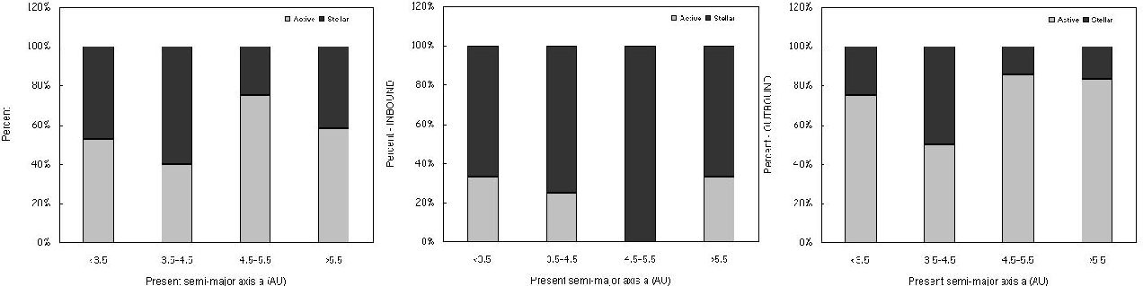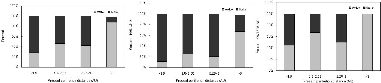 Figure 5: Distant comet activity binned according to the present comet's perihelion distance, for detected comets (with active and stellar appearance) in the ``clear cases'' database. (Left): all data. (Middle): only the comets in the inbound orbital branch. (Right): only the comets in the outbound orbital branch. |