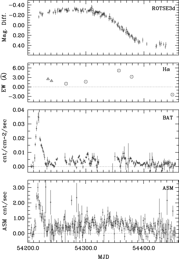 We thank the anonymous referee for a careful reading and valuable comments. This project utilizes data obtained by the Robotic Optical Transient Search Experiment. ROTSE is a collaboration of Lawrence Livermore National Lab, Los Alamos National Lab, and the University of Michigan (http://www.rotse.net). We thank the Turkish National Observatory of TÜBITAK for running the optical facilities. We acknowledge support from TÜBITAK, The Scientific and Technological Research Council of Turkey, through project 106T040. We also acknowledge the RXTE/ASM team for the X-ray monitoring data. SWIFT/BAT transient monitor results were provided by the SWIFT/BAT team.