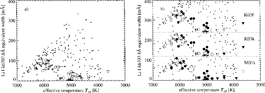 The presence of Li I absorption atA homogeneous level of both infilling of Balmer lines and Li absorption has also been detected (King & Schuler 2005; Montes et al. 2001a; Fuhrmann 2004). Interestingly, Soderblom & Mayor (1993b) noted that UMa group stars selected on the basis of spectroscopy also exhibit closer agreement with the kinematics of the nucleus of the UMa group. In the same fashion, King et al. (2003) point out that the dispersions in the space velocities increase from those of the probable activity-based members to those of the activity-based non-members - a pattern that is also found for the UMa group sequence in the HR diagram.