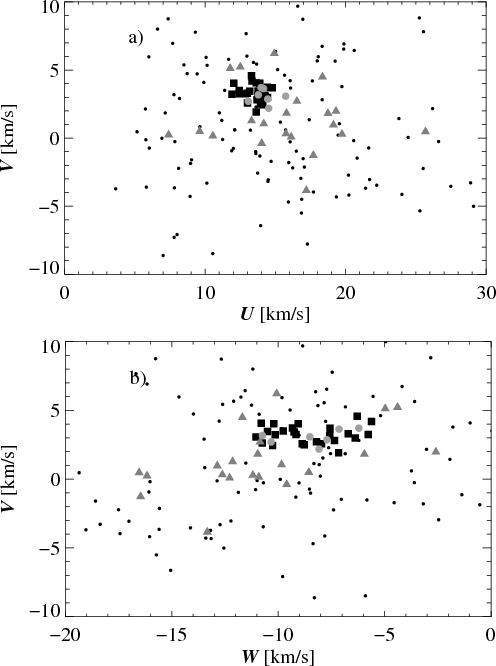 The definition of kinematic membership criteria for the UMa group has always been a matter of debate. There are basically two different approaches. The first technique defines a list of canonical members, in this case the UMa nucleus, and derives kinematic criteria based on this sample of stars (e.g., Montes et al. 2001b; Soderblom & Mayor 1993b; King et al. 2003). King et al. (2003) point out that the UMa group kinematics might be biased by the adoption of the canonical list of members. A second and unbiased approach looks for clustering in the kinematical space, an approach originating from Dziewulski (1916). Such work strongly benefits from the Hipparcos mission (e.g., Chereul et al. 1999; Asiain et al. 1999a,b).