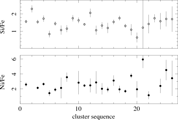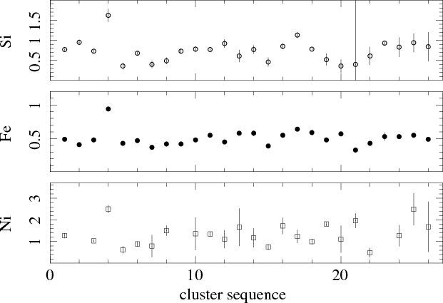 Table 3: Measurements of silicon, iron and nickel abundances relative to the solar value (Anders & Grevesse 1989) for the final sample (26 clusters for Si and Fe, 23 for Ni) from the 4T mekal spectral model.