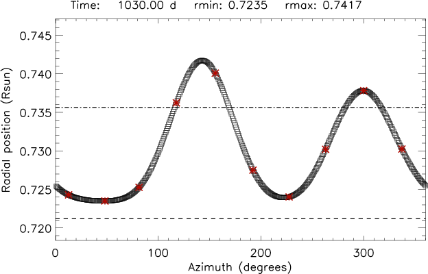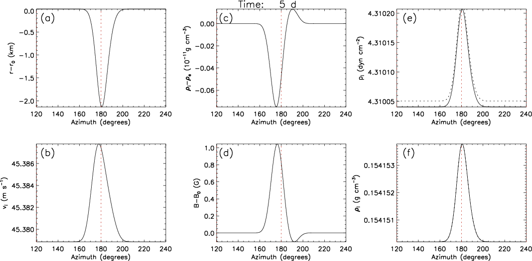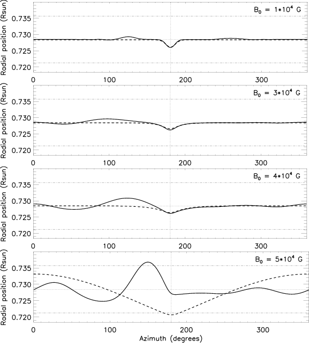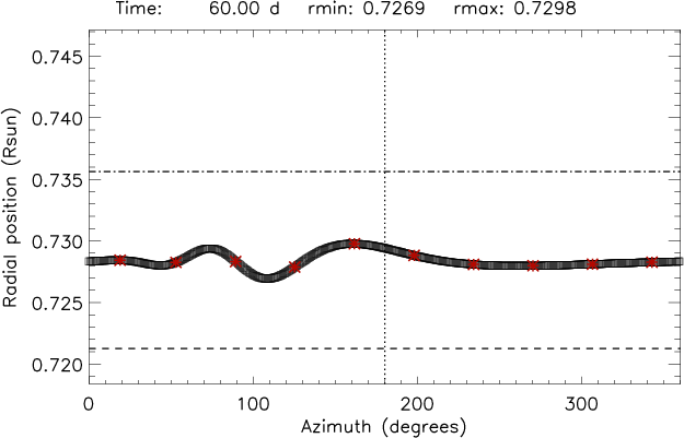 The animation files TF60.gif and TF180.gif show the evolution of a flux tube subject to a radial downflow with a duration of 60 and 120 days, respectively, until t=300 days (Sect. 3.2.2). Two snapshots are shown in Figs. C.2 and C.3, corresponding to the time when the downflow ceases in each case, i.e., at t=60 d and t=180 d. Note that for the longer-duration flow, the flux tube is radially more disturbed when the action of the downflow is finished.