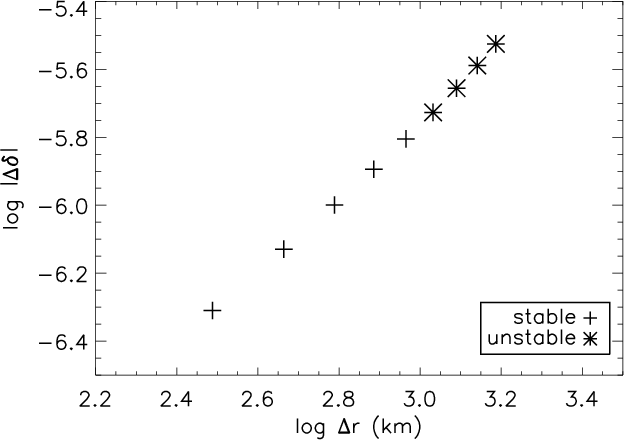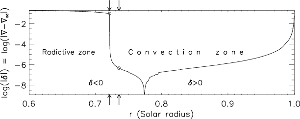 Figure 4: Radial profile of the superadiabaticity in the outer 40 per cent of the Sun, according to the solar model used (Skaley & Stix 1991). The arrows and the corresponding circles mark the boundaries of the overshoot region. |