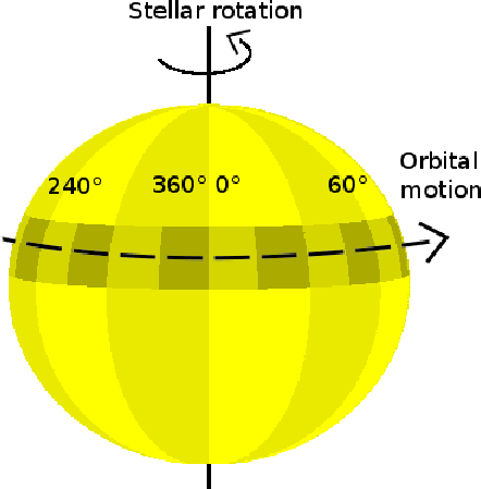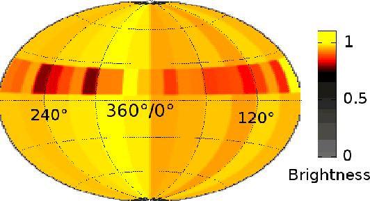 | Figure 6: Surface map of CoRoT-2a showing the reconstructed brightness distribution. Spots located on the noneclipsed surface are blurred over the entire reconstruction strip because of their unknown latitude resulting in the lower contrast compared to the eclipsed section. |
