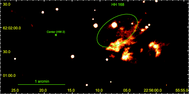 Figure 2 shows an overview of the HH 168 region in soft X-rays. In soft X-rays, vtpdetect of the Chandra CIAO 4 tools finds an extended source in the HH 168 region. We indicate the excess region by the green ellipse in Fig. 2, which approximately coincides with the lowest X-ray contour (red). In this region, there is an excess of