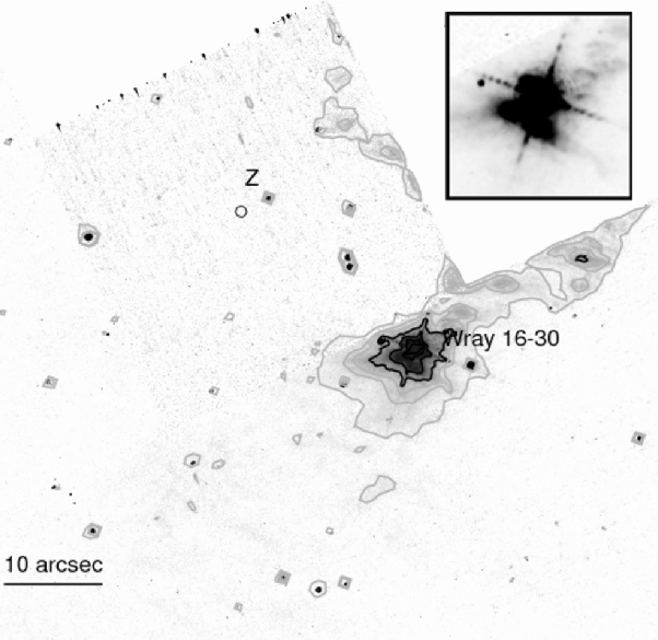 the ground-based images and also partially visible in our WFPC2 image. Thus, from the object morphology we can not confirm the identification of Wray 16-30 as a PN.