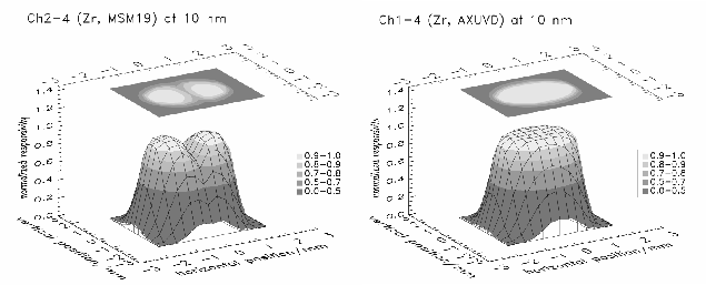 Figure 9: Homogeneity of the responsivity (3-D representation) of channel 2-4 (MSM diamond photodetector, left panel) and channel 1-4 (Si-AXUV, right panel) at 10 nm wavelength. |