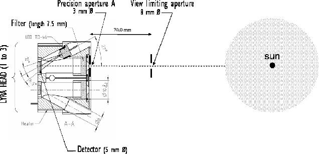 Figure 12: Schematic representation of a LYRA unit (head) with its detectors, filters, LEDs and its two apertures (not to scale). |