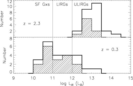 Figure 1: Histogram of infrared luminosities of all IR detected sources as derived with Eq. (1). At both redshifts, the hatched area marks genuinely certain LAE galaxies, while the open areas are AGN or unclassified objects. Solid vertical lines mark the LIRG/ULIRG definitions. |