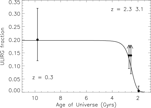 - There may be evidence that the evolution of the ULIRG fraction is not linear in time, but rather that there is a jump from redshift three to two, and then a more gradual evolution to the present time. Even though the evidence is merely suggestive at present, this jump does coincide with the number density evolution of quasars and suggests a connection between those classes of objects. This question bears strongly on the connection between starbursts and the formation of quasars, so it should be investigated more thoroughly via dedicated surveys of LAEs at several different redshifts in the range z = 2 to z = 3.5. We provide a simple formalism in the form of a three parameter function which is well suited to future tests of how sharp the transition is.