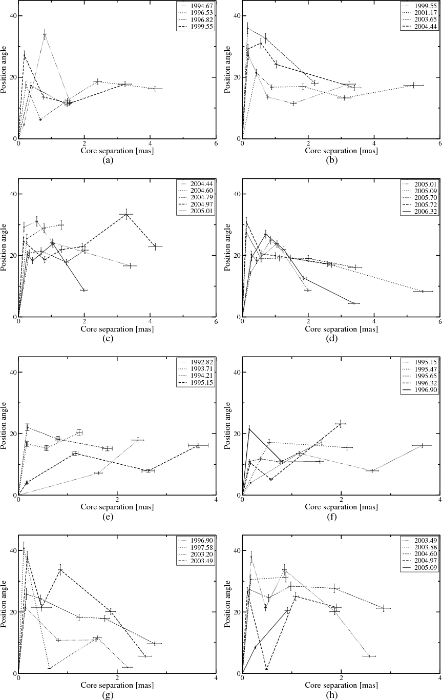 Figure 1: The jet ridge line (as defined by all component positions per epoch) is shown at 15 GHz in a)- d) and at 22 GHz in e)- h). |