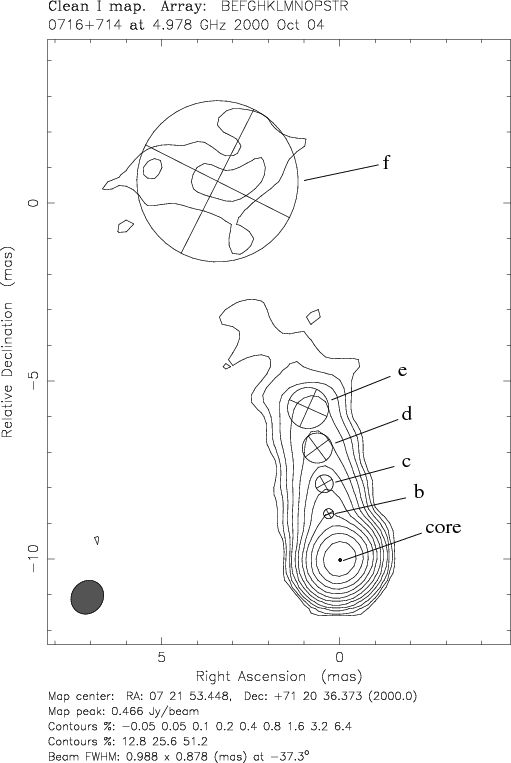 Figure 7: 5 GHz VLBI images of S5 0716+714. Model-fits convolved with the interferometric beam and with the residual map added to them are shown with the Gaussian model components superimposed. The following figures show similar images obtained at different frequencies. |