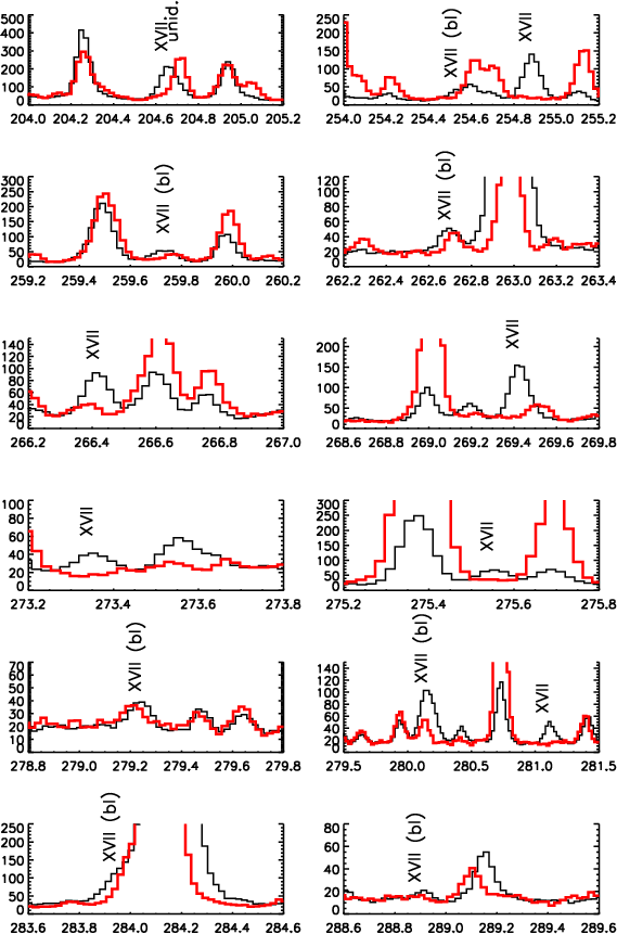During the assessment, we studied the possibility that the 204.668 Å and 254.885 Å lines are not due to Fe XVII. The morphology of the 204.66 Å and 254.88 Å lines clearly indicates that these two strong lines must be due either to Fe XVII or an ion formed at the same temperature. There are no other strong lines within a few Å of the same morphology. For example, there are no strong flare lines within a few Å of the 254.885 Å line. In theory, the decay of the 2p5 3p 1S0 to the 3P1 level could be blended with the group of lines around 256.3-256.4 Å, although this would require the decay to 1P1 to be placed around 205.6 Å, where no flare lines are present.