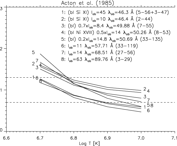 In the rocket flight spectrum of Acton et al. (1985), no line is reported around 87.30 Å. On the other hand, Acton et al. (1985) reports an unidentified line at 89.76 Å, in excellent agreement with our predicted wavelength. Its intensity is within an excellent 30% agreement with theory, together with various other transitions that we believe to have identified for the first time in the same spectrum, as shown in Fig. 3 and Tables 2, 3.