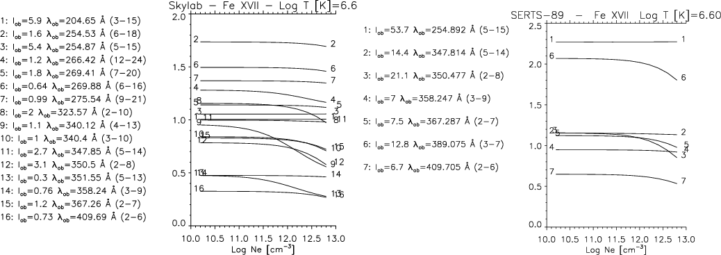 Figure 4: The emissivity ratio curves (at log T[K] = 6.6) relative to the transitions observed by the Skylab NRL spectrometer during a flare (Doschek et al. 1991) ( left) and the 1989 SERTS rocket flight (Thomas & Neupert 1994) ( right). |
