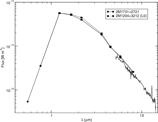 Spectral energy distribution of 2MASS J17312974+2721233 (dots). V-band