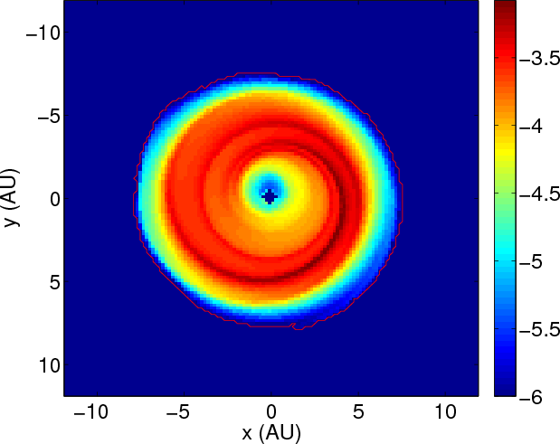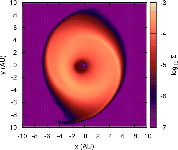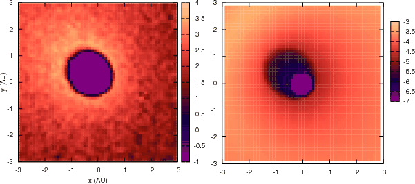 | Figure A.1: Number density of a set of test particles in Keplerian orbits depleted of all those having pericenter lower than 0.5 AU ( left plot) and outcome of FARGO ( right plot). The color density in the right plot gives the logarithm of the gas density in normalized units. |