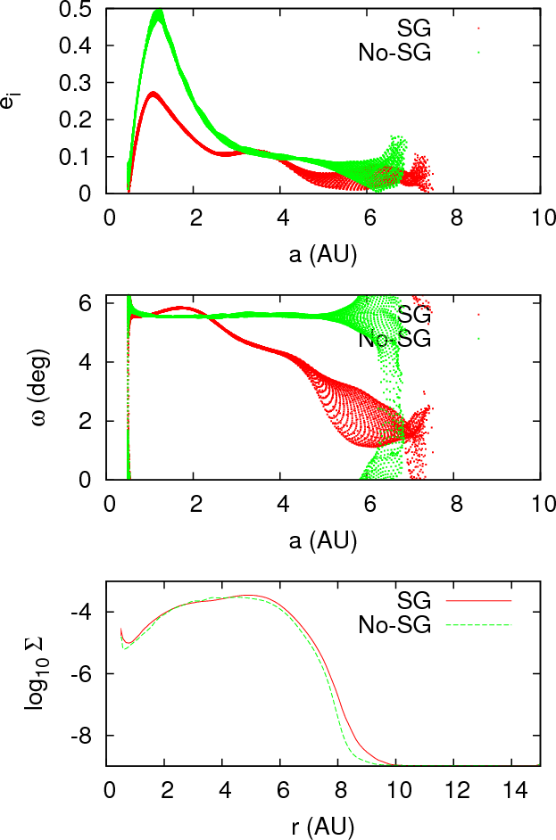 ranging from 0.1 to 3 AU. The eccentricity and pericenter longitude