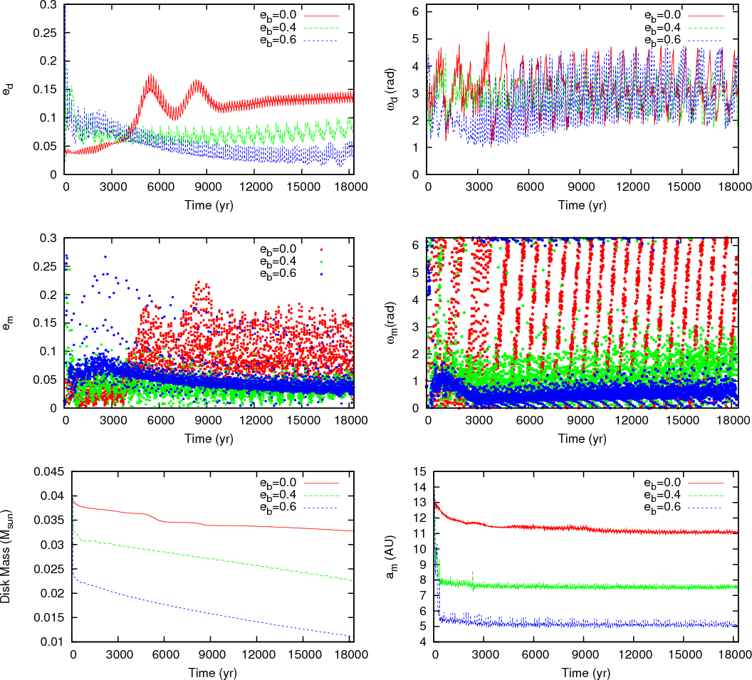 Understanding the morphology of circumprimary gas disks is also crucial for the subsequent phase of planetesimal accumulation. Indeed, several recent studies have shown that this stage might be severely hampered, or even stopped by the combination of secular perturbations from the companion star and friction with gas (Xie & Zhou 2008; Thébault et al. 2009,2006,2008). This combined effect forces a differential phasing of planetesimal orbits according to sizes, which leads to high impact velocities for a large fraction of planetesimal-planetesimal collisions, which could in some cases lead to an accretion-hostile dynamical environment. Paardekooper et al. (2008) have shown that these results, obtained assuming static axisymmetric gas disks, could be further amplified when letting the gas disk evolve and ``feel'' the binary perturbations. The most accretion-hostile cases were obtained when the gaseous disk reached high eccentricities, with impact velocities almost twice as high as in the axisymmetric case, while low eccentricity disks gave results similar to that with a static disk There is in principle a possibily for an eccentric gas disc to lead to lower drag effects, that is, if this eccentricity is close to the forced secular eccentricity of the planetesimals (see Eq. (17) of Paardekooper et al. 2008). However, this theoretical behaviour is only possible for a very specific radial profile of the gas disk density and has never been observed in test simulations, indicating that this case is probably only a marginal possibility (see detailed discussion in Sect. 6.1 of Paardekooper et al. 2008).