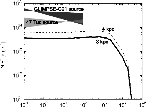 To provide a distance-independent indicator of the emission mechanism, it is instructive to compare the X-ray source counts in the GLIMPSE-C01 and 47 Tuc case. The cluster population of X-ray binaries are indeed believed to be the direct progenitors of the gamma-ray emitting MSPs (see e.g., Bhattacharya 1996, for a review). Pooley et al. (2007) report 13 sources with unabsorbed 0.5-8 keV X-ray luminosity above 1031 erg s-1. In contrast, the comprehensive X-ray survey of 47 Tuc by Heinke et al. (2005) yielded nearly 3 times more sources above a similar luminosity and energy range. Thus, although Pooley et al. (2007) infer a high production rate of X-ray binary systems by means of close stellar encounters, this is not observationally translated into a significantly enhanced X-ray source population.