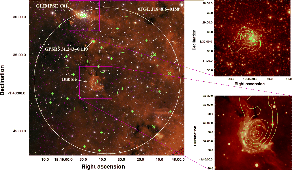 Another remarkable object inside the Fermi error circle is the bright radio source GPSR5 31.243-0.110, which likely to be an ultracompact HII region (Giveon et al. 2007) based on its morphology. Its gamma-ray emitting nature is unclear given the lack of suitable physical scenarios for this kind of object.