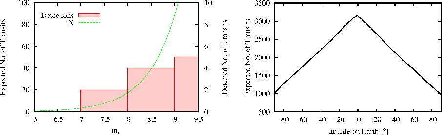 Usually, authors of studies on the expected yield of transit surveys generate a fictive stellar distribution based on stellar population models. Fressin et al. (2007) use a Monte-Carlo procedure to synthesize a fictive stellar field for OGLE based on star counts from Gould et al. (2006), a stellar metallicity distribution from Nordström et al. (2004), and a synthetic structure and evolution model of Robin et al. (2003). The metallicity correlation, however, turned out to underestimate the true stellar metallicity by about 0.1 dex, as found by Santos et al. (2004) and Fischer & Valenti (2005). In their latest study, Fressin et al. (2009) first generate a stellar population based on the Besançon catalog from Robin et al. (2003) and statistics for multiple systems from Duquennoy & Mayor (1991) to apply then the metallicity distribution from Santos et al. (2004) and issues of detectability (Pont et al. 2006). Beatty & Gaudi (2008) rely on a Galactic structure model by Bahcall & Soneira (1980), a mass function as suggested by Reid et al. (2002) based on Hipparcos data, and a model for interstellar extinction to estimate the overall output of the current transit surveys TrES, XO, and Kepler. In their paper on the number of expected planetary transits to be detected by the upcoming Pan-STARRS survey (Kaiser 2004), Koppenhoefer et al. (2009) also used a Besançon model as presented in Robin et al. (2003) to derive a brightness distribution of stars in the target field and performed Monte-Carlo simulations to simulate the occurrence and detections of transits. These studies include detailed observational constraints such as observing schedule, weather conditions, and exposure time and issues of data reduction, e.g. red noise and the impact of the instrument's point spread function.