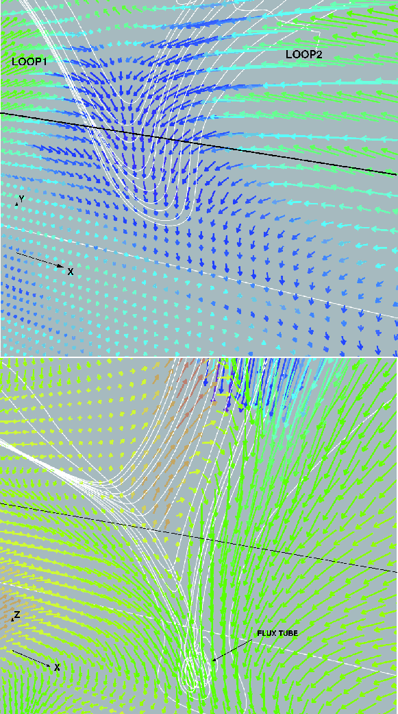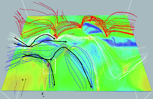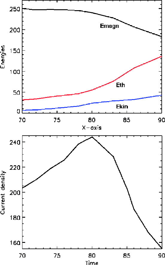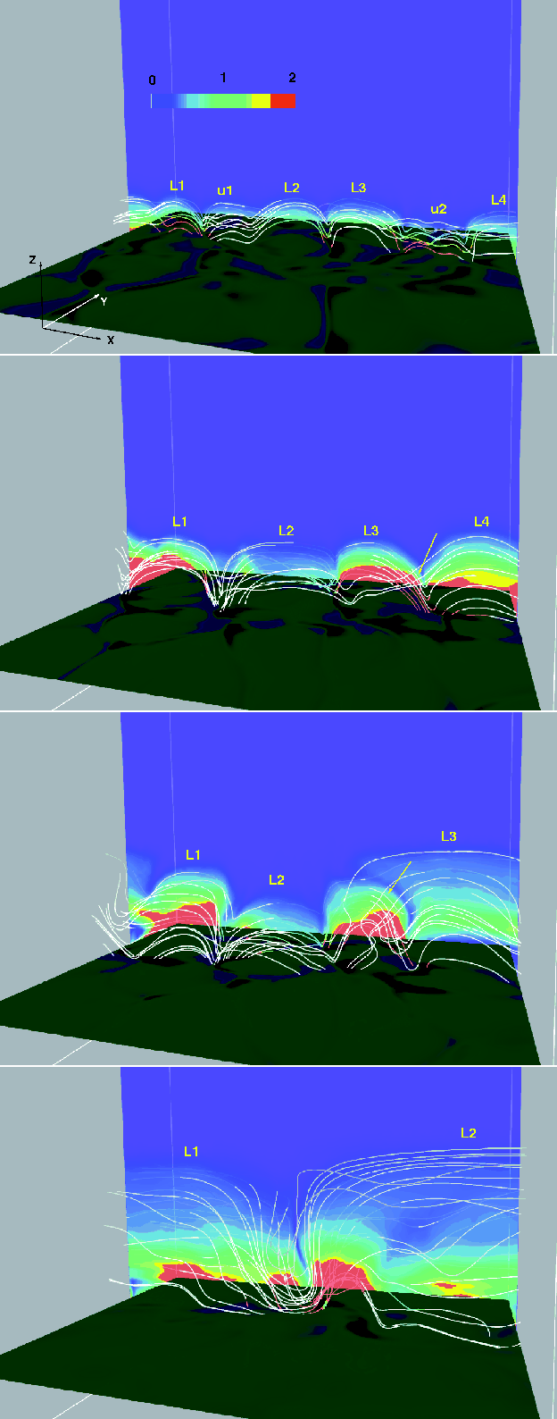 In our numerical experiments, rotational discontinuities in the higher atmosphere are formed not only when new magnetic flux interacts with ambient field but also due to the very dynamical interaction between neighbouring emerging loops. The fieldlines of the expanding loops are free to move in three dimensional space and, thus, it is not unlikely that sets of fieldlines with opposite orientations press against each other and form strong current sheets. An example of this type of interaction between emerging fields is given in Fig. 4. The region between the loops L3 and L4 (marked with an arrow, at t=70 and t=90) is where current density increases, followed by an enhancement of the temperature in the corona. The 3D interaction between an emerging twisted flux tube (or flux sheet) and a pre-existing field in the corona has been studied in more detail by Archontis & Hood (2008), Galsgaard et al. (2005) and Isobe et al. (2005).