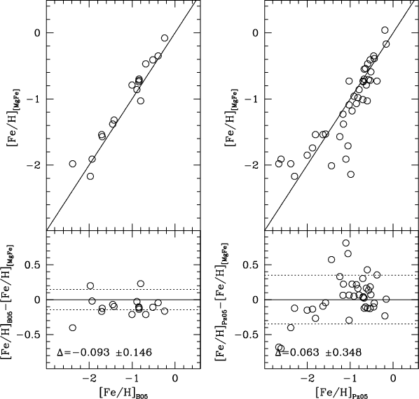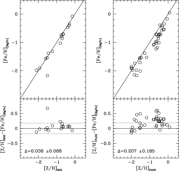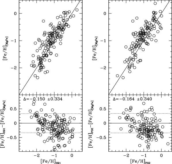 - It is important to recall that our scale is not expected to strictly trace the abundance of iron. In fact, it is based on the ZW84 scale that, in turn, is based on the metallicities derived by Cohen (1983) from lines of various elements, including Mg (see Mendel et al. 2007, for a detailed discussion and references). Therefore it is likely a better proxy for the total metallicity than for the actual iron abundance.