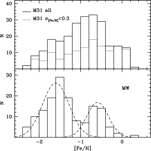 integrated colors, Barmby et al. (2000) found evidence that the M 31 GC system may have a bimodal metallicity distribution (like the MW, Zinn 1985), with peaks at [Fe/H]